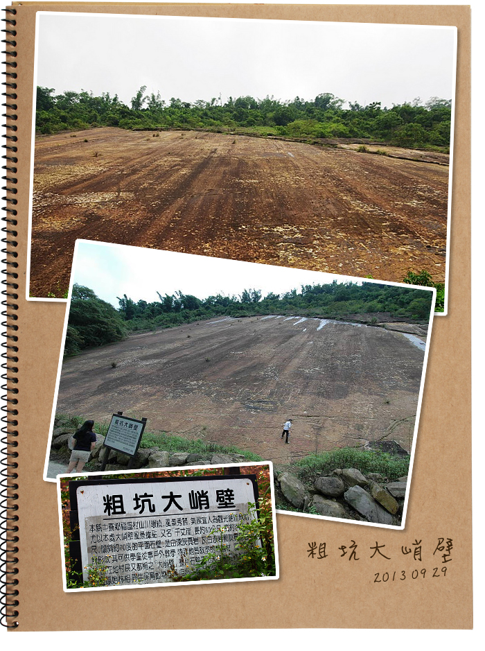 粗坑大峭壁又稱「千丈崖」,它是一面長約有八十公尺,高約百餘公尺,傾料約七十度,渾然天成的巨型平面不壁;峭壁本身是層理分明的順向坡,主要是由深灰頁岩、灰白砂岩以及灰質層岩組成而成的石壁,由於它年年都會崩解剥落,所以當地居民也稱它為「大崩壁」。如果我們站在大崩壁的底部抬頭迎望,一派黃沙掩映間雜著斑駁灰岩,盡顯蒼勁氣勢,使人不禁會聯想起昔日塞外男兒橫刀立馬,粗獷豪邁的威武英姿;而當我們鼓起勇氣,舊力登上大峭壁,站在峭壁項端俯視著下方巡禮,這時一種征服的快感便油然而生,心中自然湧起「登泰山而小下」,睥睨四方的壯志豪情了。(文章來目:探索中寮 總編輯:白文智)